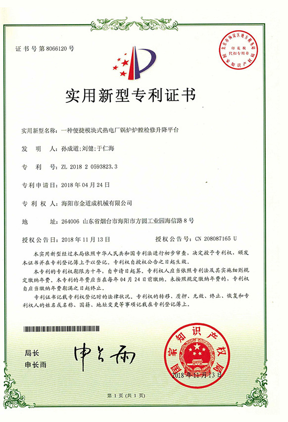 公司成立于2008年,年產“鍋爐爐膛檢修升降平臺”100余臺套的能力。自主研發的下支撐折疊式GJPT系列熱電廠鍋爐爐膛檢修升降平臺,于2016年獲得行業首項國家專利保護;經過數年的發展,為各種型號煤粉鍋爐和循環流化床鍋爐的爐膛檢修,提供出一系列門類齊全的檢修平臺設計方案,先后為國家能源集團、華潤電力、大唐集團、晉煤集團、益海嘉里集團公司、嘉吉糧油公司、中糧集團公司、山東時風集團、阜豐生物科技、晉煤集團等400余家公司設計、定制了鍋爐爐膛檢修升降平臺。