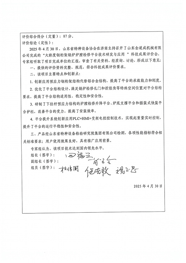金道成鍋爐爐膛檢修平臺(tái)新技術(shù)獲國(guó)內(nèi)權(quán)威認(rèn)證